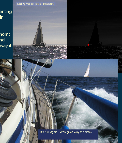There are several parts to this - the give way rules, who gives way to whom; the lights and shapes, a clever system whereby you can tell by night, and also sometimes by day, what type of vessel you are seeing and which way it