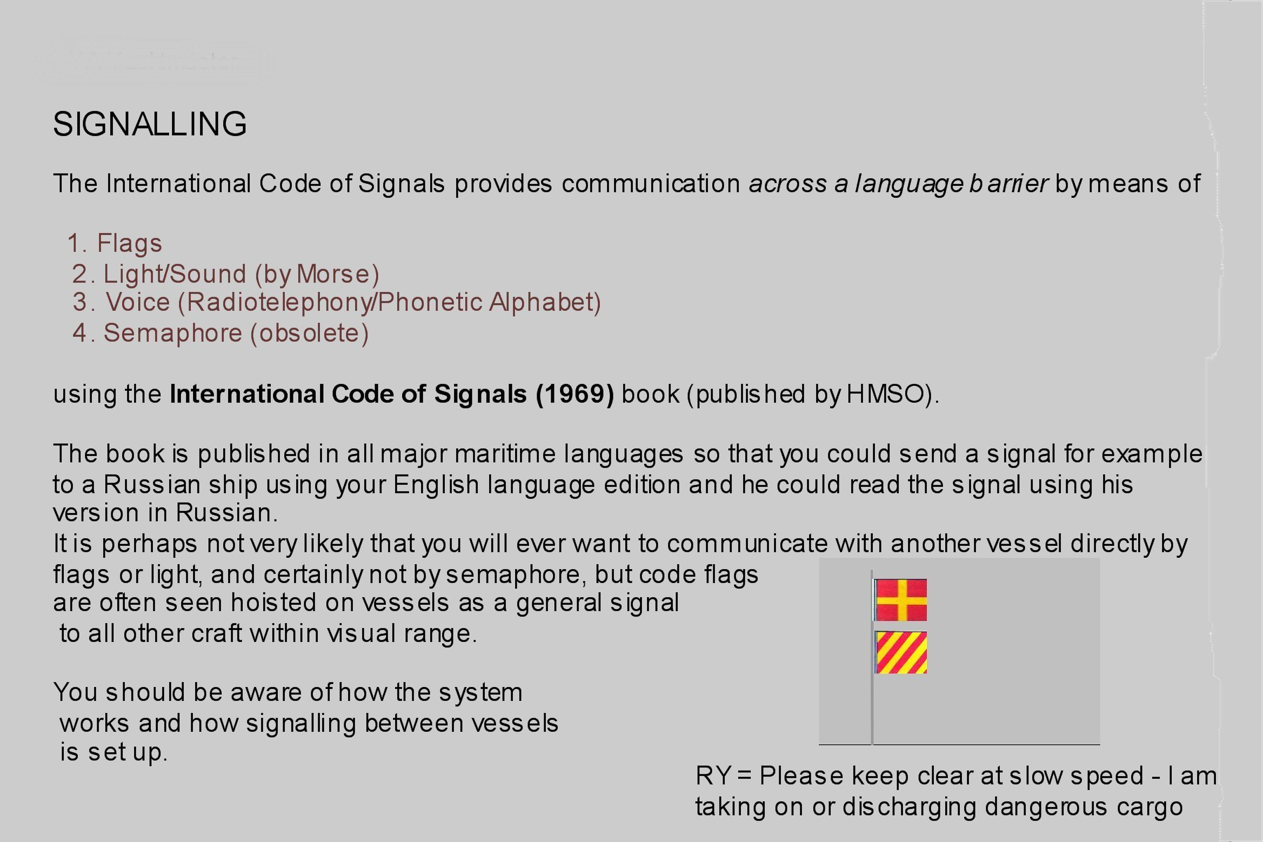 Signalling by flags or morse using the International code is a bit old hat nowadays but it is still used. It is commonplace to see a ship alongside a jetty flying RY (International Code two letter signal ‘Please keep clear at slow speed, I am taking on or discharging dangerous cargo’) or a vessel under way showing code flag H - ‘I have a pilot on board’. An outline knowledge of International Code signalling procedures is required and is covered in this section. General principles of flag etiquette are also covered